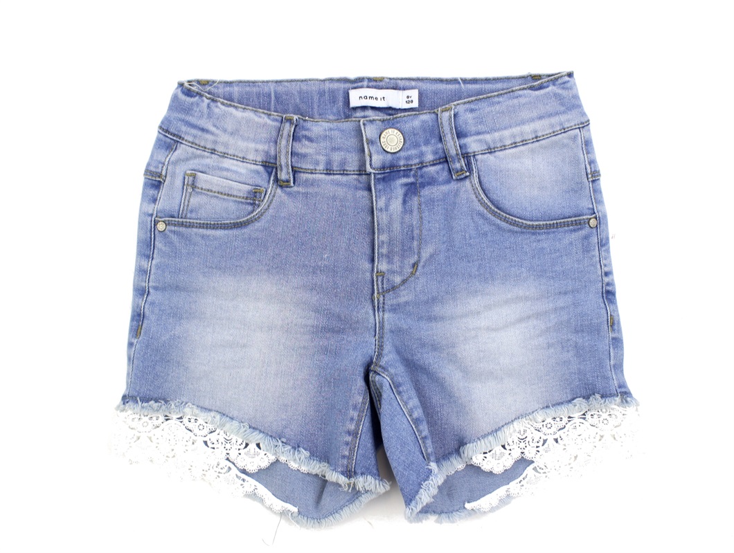 Denimshorts med hvide blonder i bukseben fra Name It.