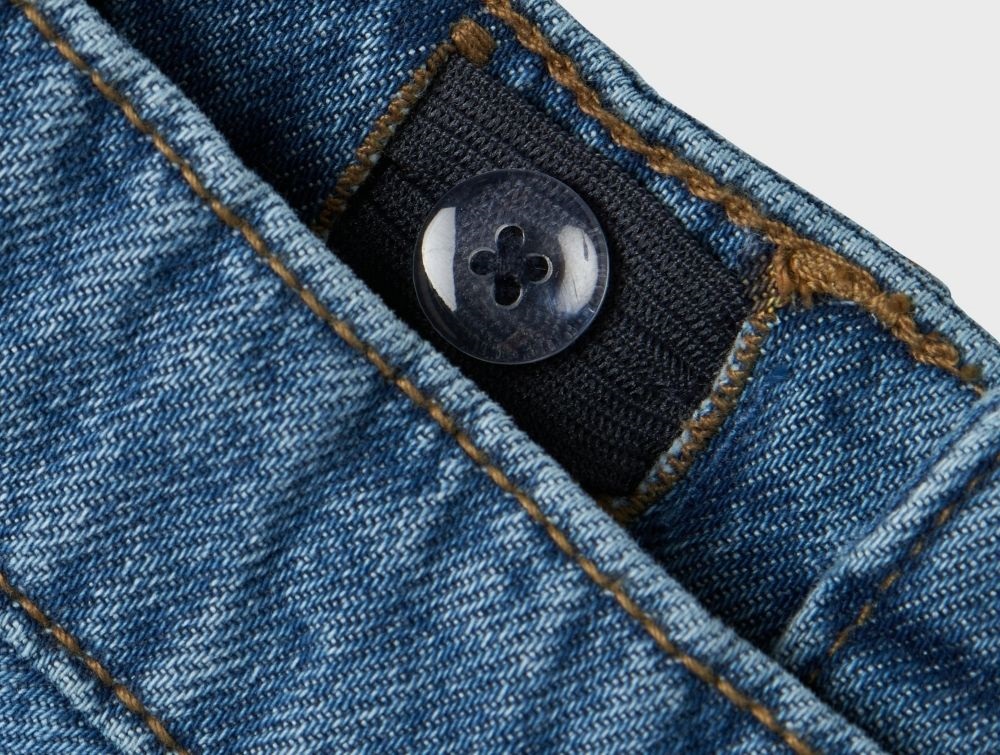 Denimshorts i mellem blå fra Name It med præget palmetræ-print – en sjov og sommerlig style med klassisk jeans-look.