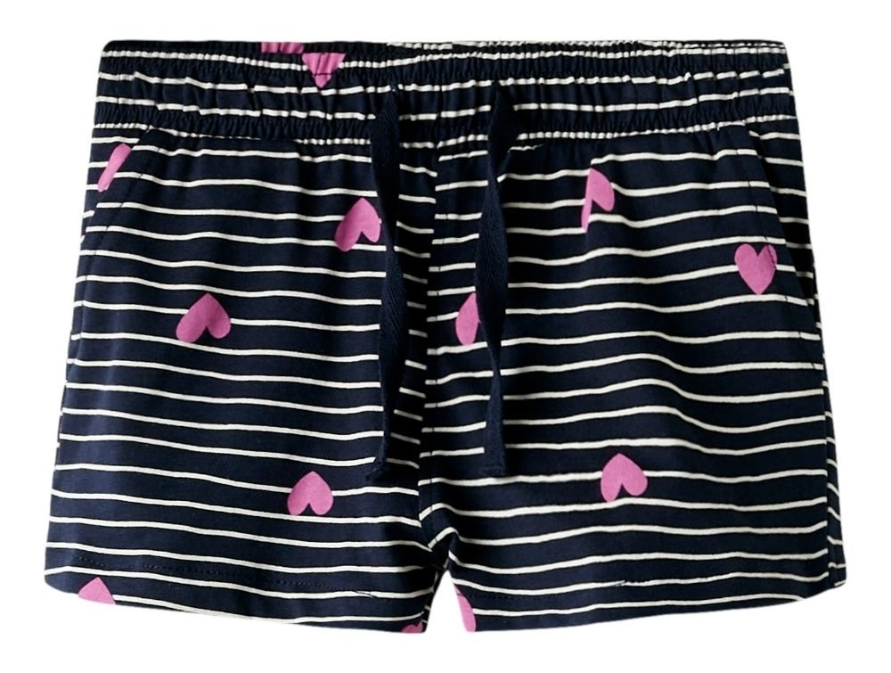 Mørkeblå shorts fra Name It med hvide striber og pink hjerter 13215112 dark sapphire heartsPrint med hvide striber og pink hjerter på shorts fra Name It 13215112 Dark Sapphire hearts