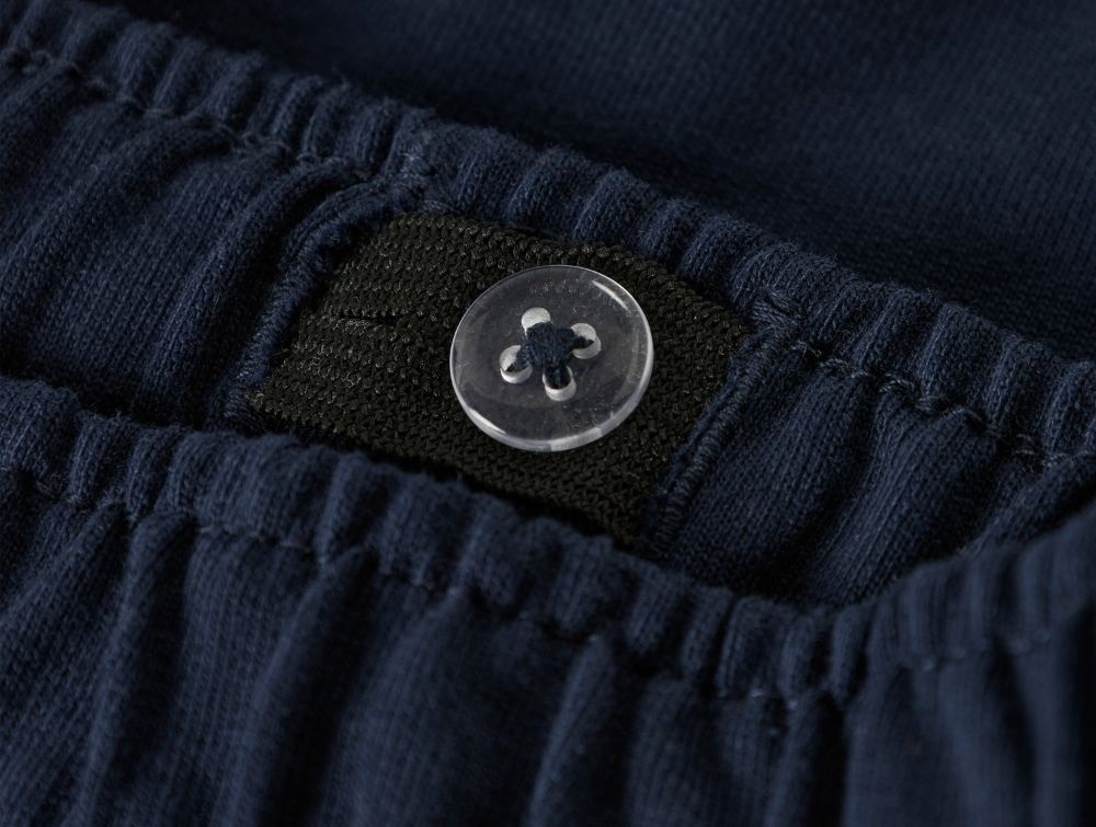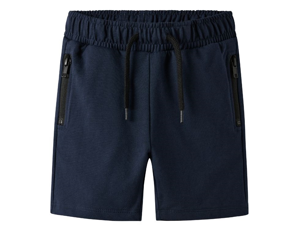 name it shorts i mørkeblå med sorte lynlåslommer, set forfranærbillede af justerbar elastik i mørkeblå name it shorts