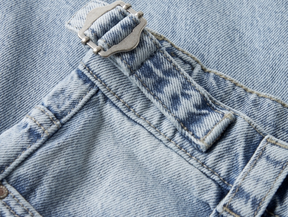 Fremstillet i 80% bomuld og 20% bomuld (genanvendt), hvilket giver en fast denimkvalitet med en naturlig fornemmelse. Stoffet har tydelige slid- og vaskedetaljer, der understreger det rå udtryk.