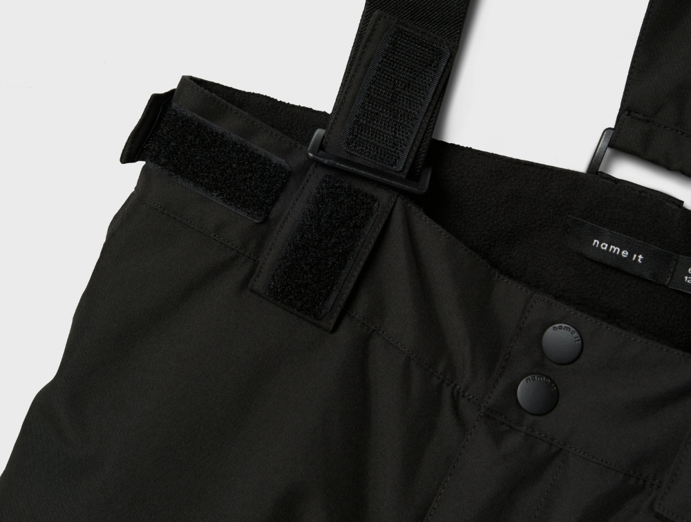 Name It skibukser black til børn med selerBarn iført sorte Name It skibukser til skiDetalje af taljejustering på sorte Name It skibukserBenafslutning med lukning på sorte Name It skibukserBagside af sorte Name It skibukser til børn