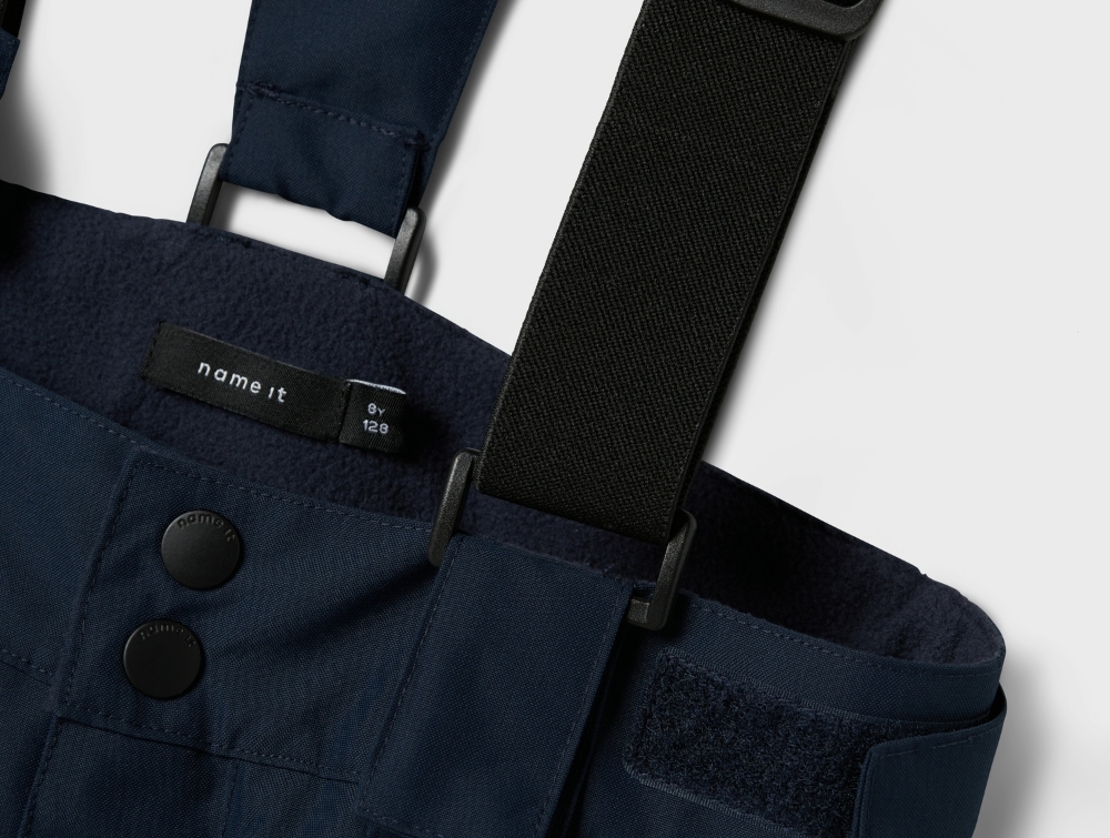 Skibukser i mørkeblå nuance (dark sapphire) fra Name It med justerbare seler og refleksdetaljer. Bukserne er ideelle til aktive dage i sneen og holder barnet varmt og tørt.
