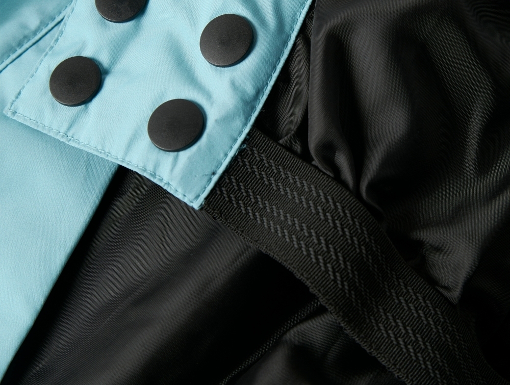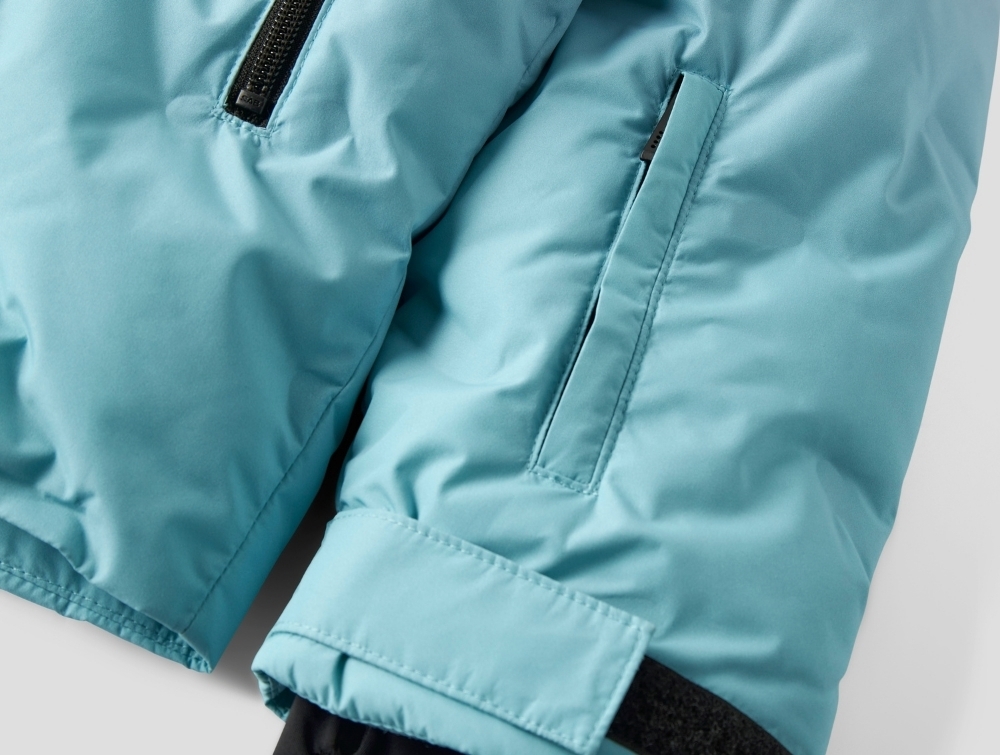 Jakken lukkes med lynlås med hagebeskytter, har to sidelommer med lynlås og en praktisk ærmelomme. Snefang i ærmerne forhindrer sne i at trænge ind, mens den aftagelige hætte øger sikkerheden. Refleksdetaljer gør barnet mere synligt i mørke timer. Indvendigt har jakken et snefang i bunden, som knappes fortil, så sne holdes helt ude ved aktivitet i sneen.