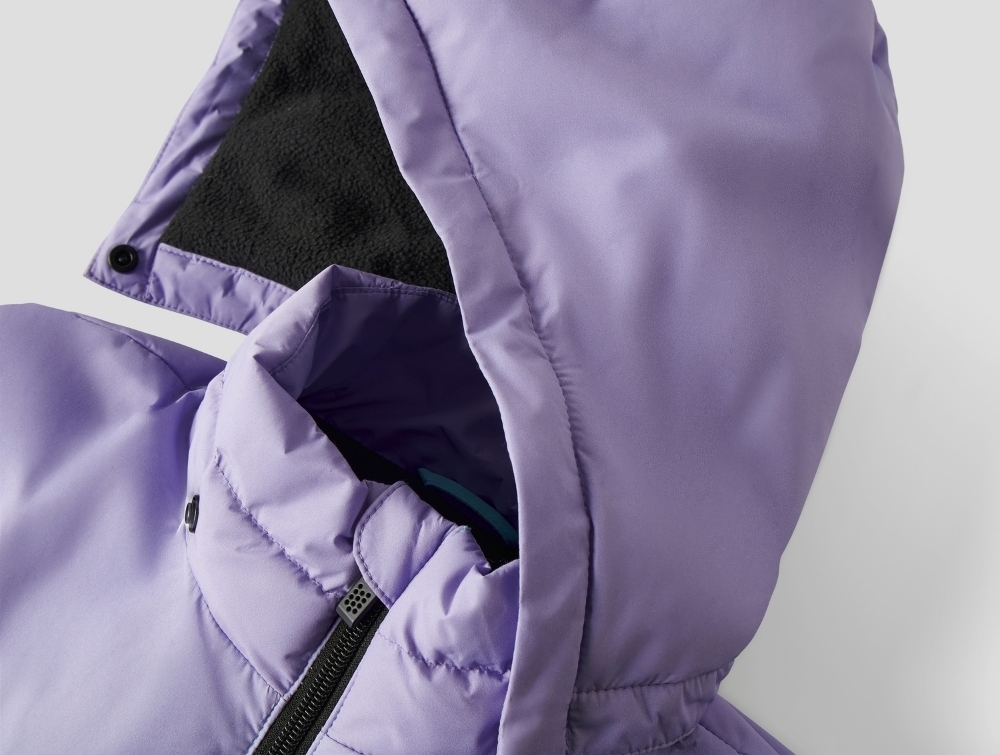 Front af lilla Name It skijakke til pigerDetalje af hætte på lilla Name It skijakkeÆrmedetalje på lilla Name It skijakkeSnefang indvendigt på lilla Name It skijakkeBagside af lilla Name It skijakke med refleksdetaljer