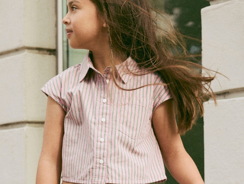 Designet har korte ærmer, klassisk skjortekrave og knaplukning foran. De lodrette striber giver et enkelt udtryk, og skjorten har en brystlomme samt almindelig pasform.
