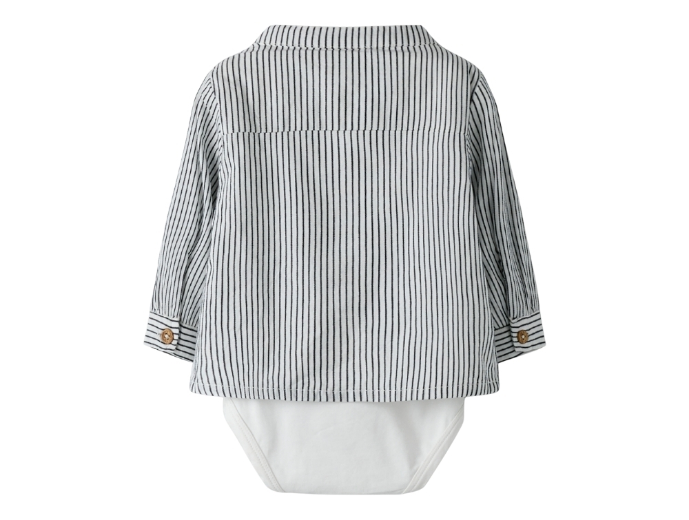 Modellen er fremstillet i 100% bomuld (økologisk) i en let vævet kvalitet med diskret struktur. Den kombinerer det klassiske skjortelook med den praktiske bodyfunktion, så barnet er pænt klædt og samtidig godt tilpas.