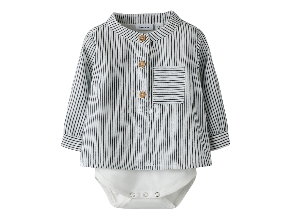 Skjortebodyen har skjortekrave, knaplukning foran og trykknapper i bunden, som gør bleskift nemt. En lille brystlomme fuldender det enkle og fine udtryk.