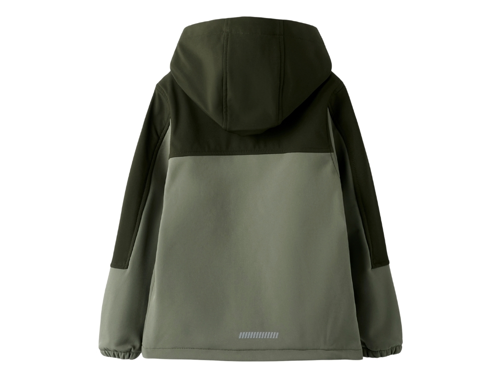 Name It softshell jakke i dusty olive set forfra  Name It softshell jakke i dusty olive set bagfraDetalje af aftagelig hætte på Name It softshell jakke i dusty olive Refleksdetalje på Name It softshell jakke i dusty olive