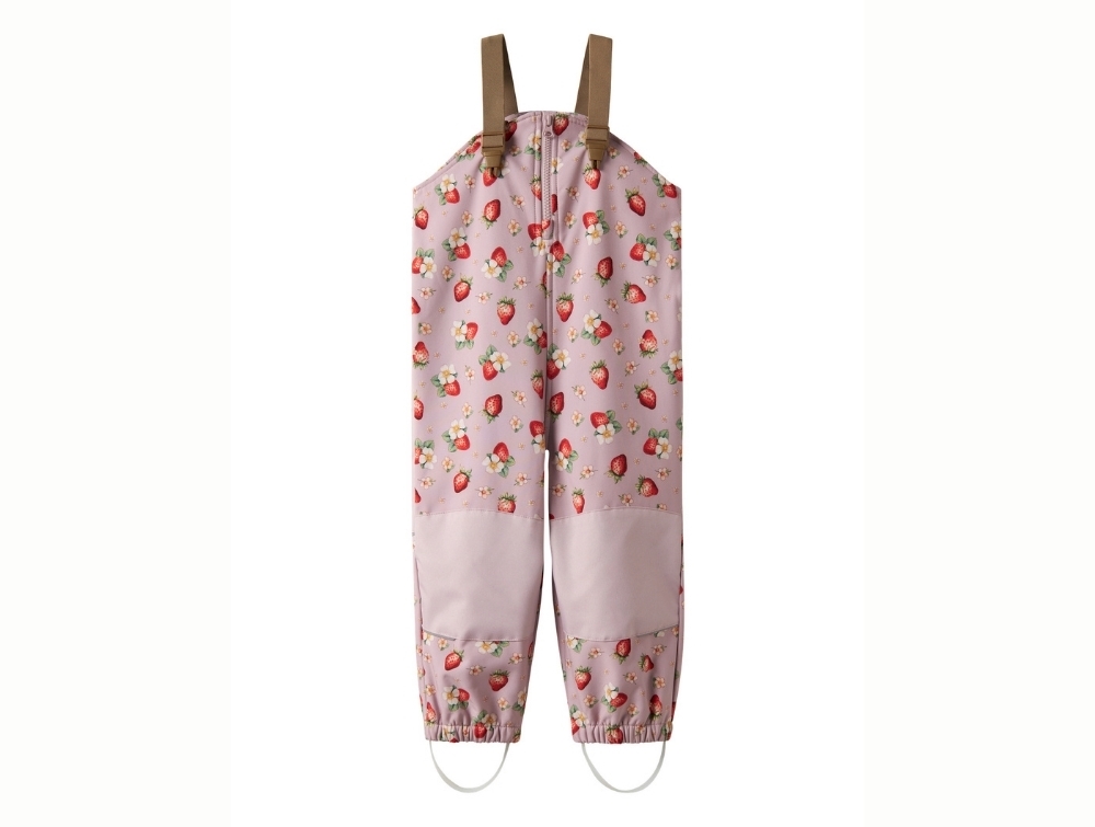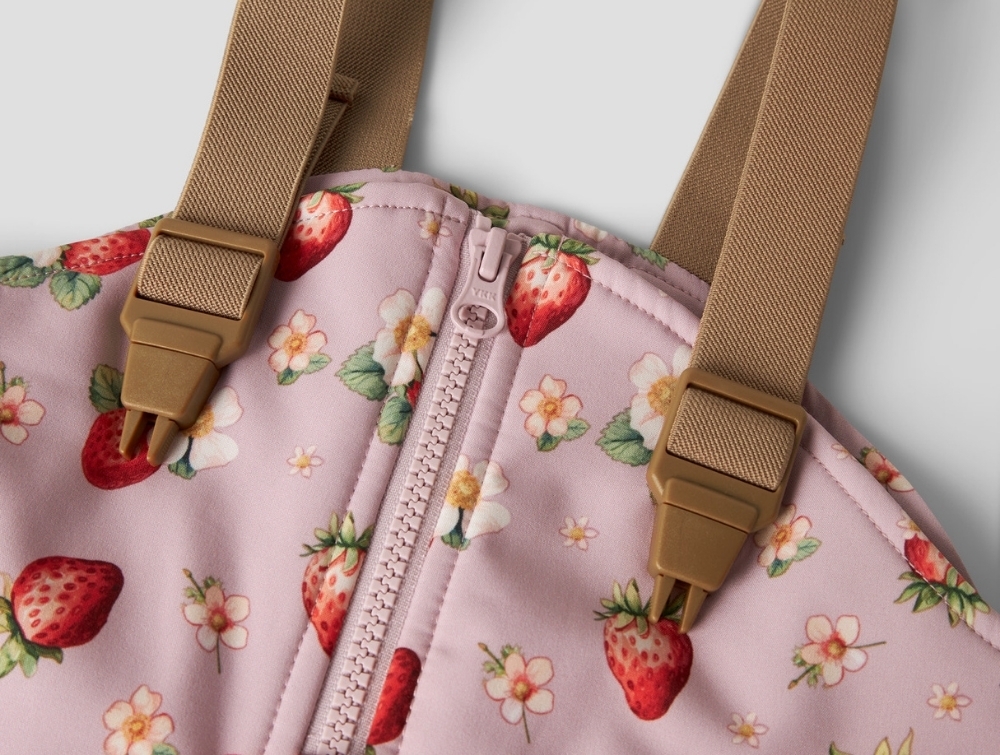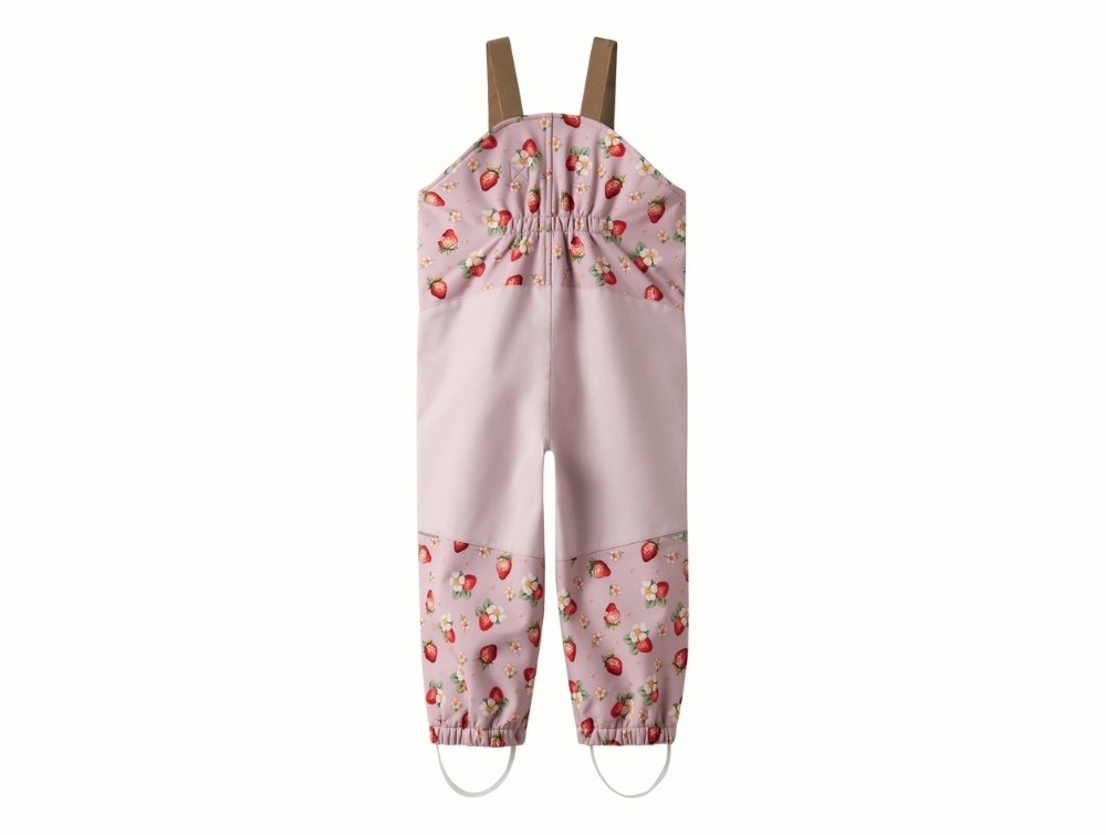 Name It softshellbukser i rosa nuance med jordbærprint på barnName It softshellbukser i rosa nuance med jordbærprintName It softshellbukser med justerbare seler og lynlåsName It softshellbukser med elastik ved ben og fodstropName It softshellbukser set bagfra i rosa nuance