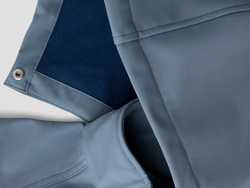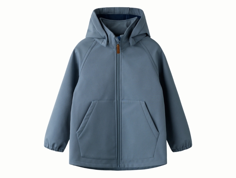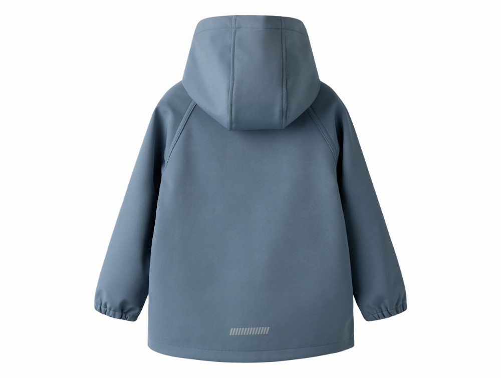 Softshelljakken er vandafvisende og åndbar, så barnet kan lege komfortabelt på kølige og let regnfulde dage. Jakken har aftagelig hætte for sikkerhed, lynlåslukning med lynlåsvagt samt elastik ved ærmerne, som hjælper med at holde vind ude. Det indvendige fleecefor giver en blød og lun fornemmelse.