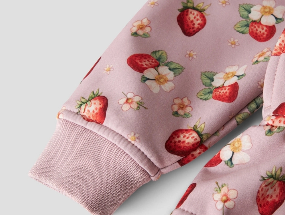 Softshelljakke i lyserød nuance (keepsake lilac) fra Name It med allover jordbærprint.