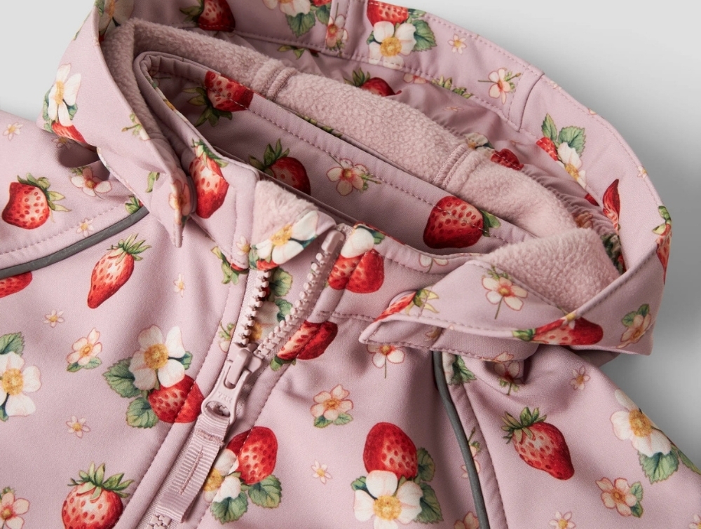 Name It softshelljakke i lyserød nuance med jordbærprint og hætte