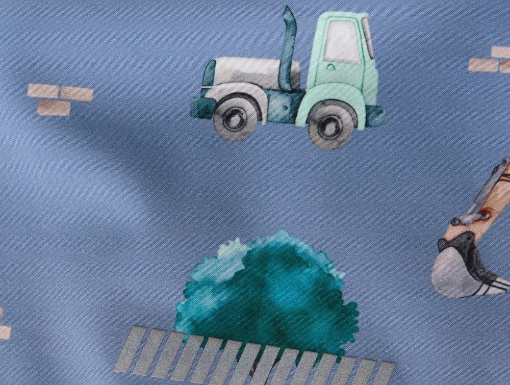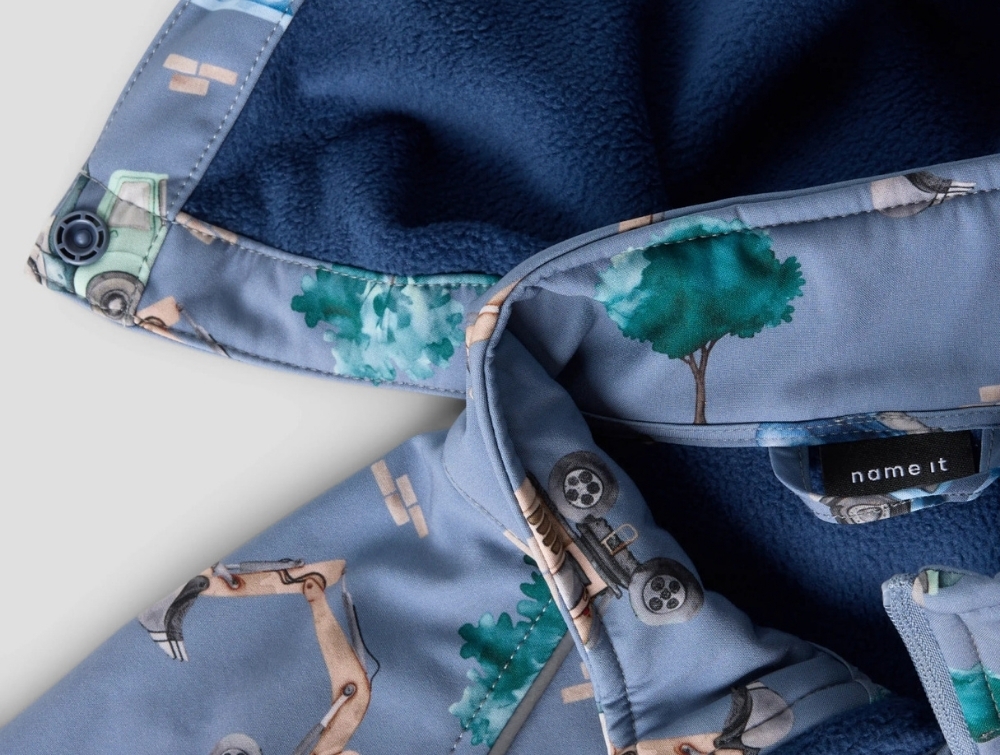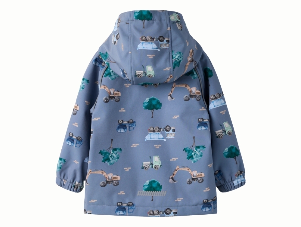 Name It softshelljakke i blå nuance med arbejdsbilprint på barnName It softshelljakke i blå nuance med arbejdsbilprintName It softshelljakke med fleecefor og lynlåsvagtName It softshelljakke med arbejdsbilprint i blå nuanceName It softshelljakke set bagfra i blå nuance
