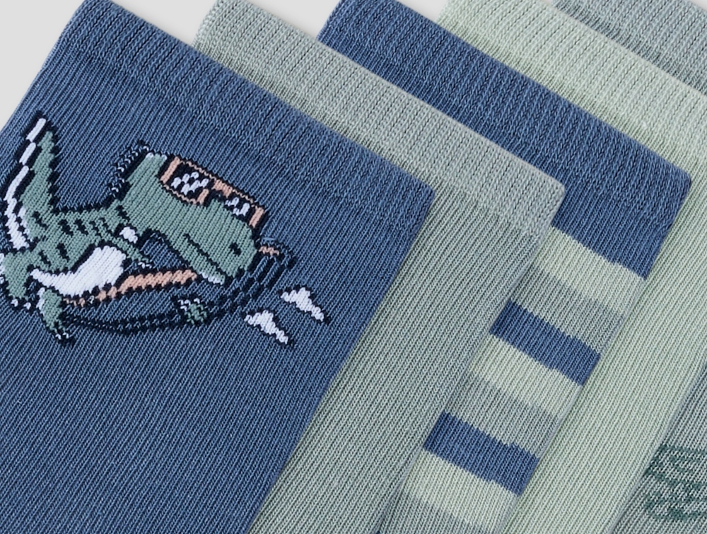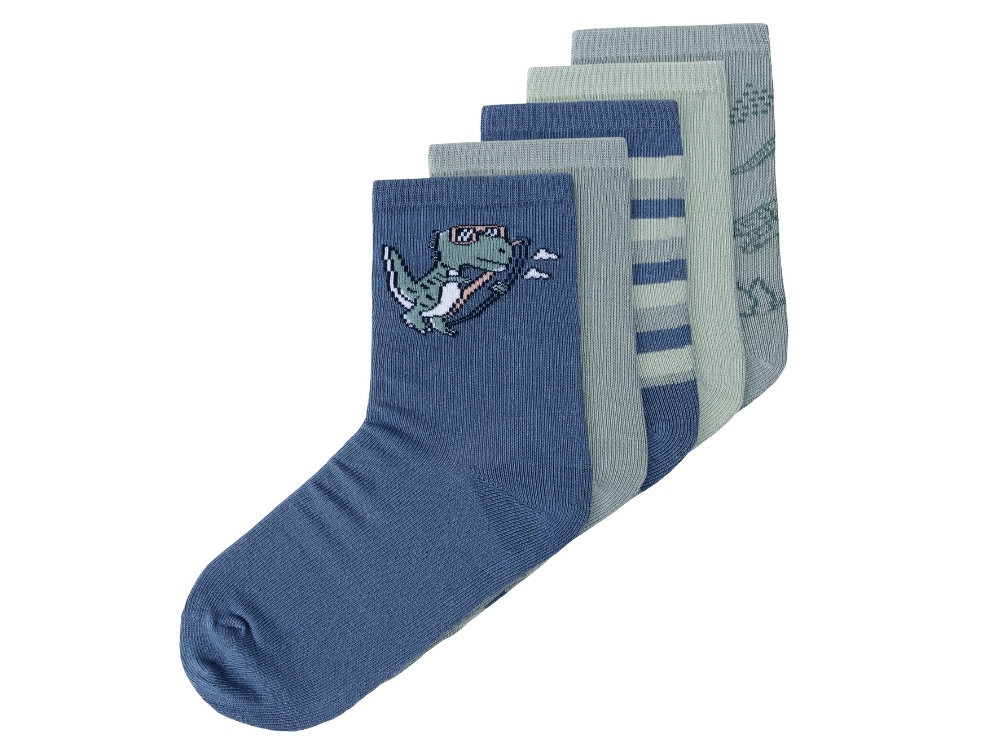 Strømper i blå og støvede grønne nuancer (blue mirage) fra Name It. Pakken indeholder fem par sokker med forskellige motiver – herunder dinosaur og striber.