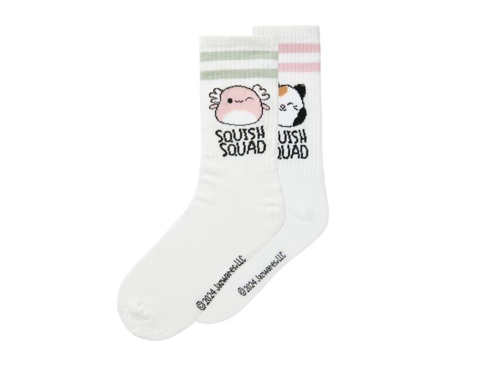 Sokkerne er lavet i blød, ribstrikket kvalitet med vævede jacquard-figurer, som giver struktur og klarhed i detaljerne. Et perfekt valg til børn, der elsker Squishmallows og TikTok-venlige styles.
