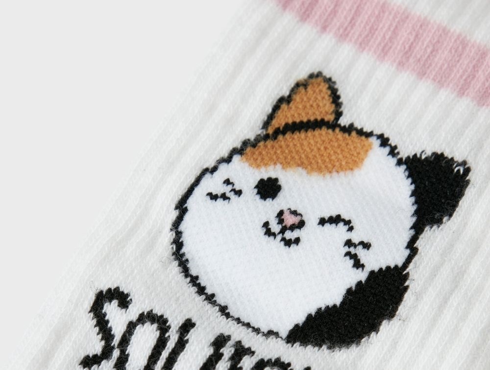2-pak name it sokker i hvid med squishmallows motiver og stribernærbillede af squishmallows axolotl motiv med grønne striber på sok i hvidnærbillede af squishmallows kattemotiv med lyserøde striber på sok i hvid