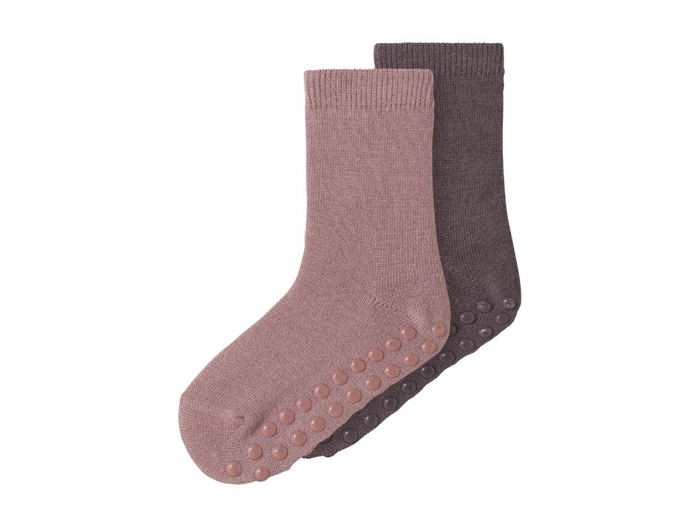 Name It sokker i støvet violet og mørkelilla i merinould mix med skridsikker mønster 2-pak