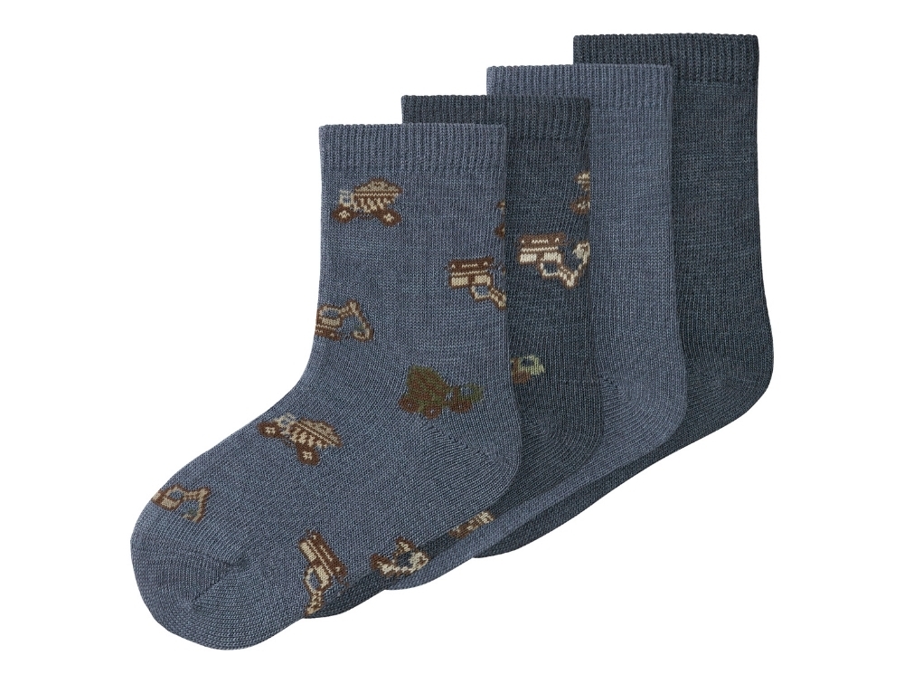 Pakken indeholder både ensfarvede strømper og strømper med mønster af arbejdskøretøjer. En blød og funktionel basispakke til børn, der kan bruges året rundt.