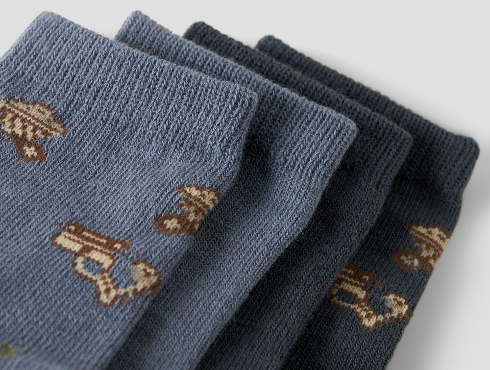 Name It sokker 4-pak i blågrå nuance med biler i merinould mixName It sokker 4-pak i blågrå nuance med bilprint i merinould mix tæt detalje