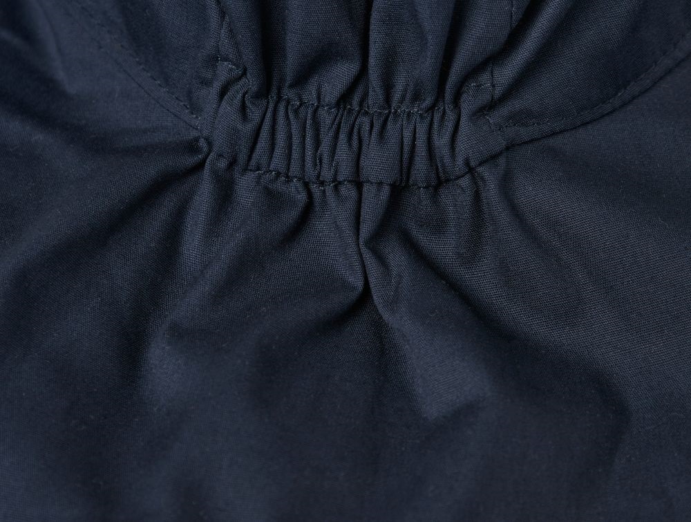 Let og luftig solhat i mørk blå vævet bomuld. Hatten har elastik bagtil, som hjælper den med at sidde godt på hovedet, samt bindebånd fastgjort ved siderne, der kan bindes under hagen. Perfekt til solrige dage.