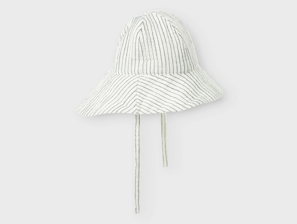 Solhat til baby med striber i vævet bomuld og med bindebånd