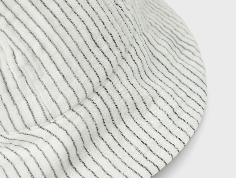 Hatten har bindebånd under hagen og er lavet i vævet bomuld med et klassisk stribet mønster.