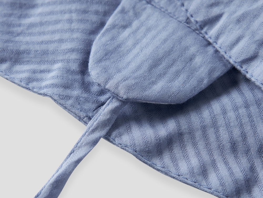 Solhatten er fremstillet i 100% bomuld (økologisk) i en let vævet kvalitet med diskret struktur i overfladen. Materialet føles blødt og behageligt mod huden og giver en luftig fornemmelse på varme dage.