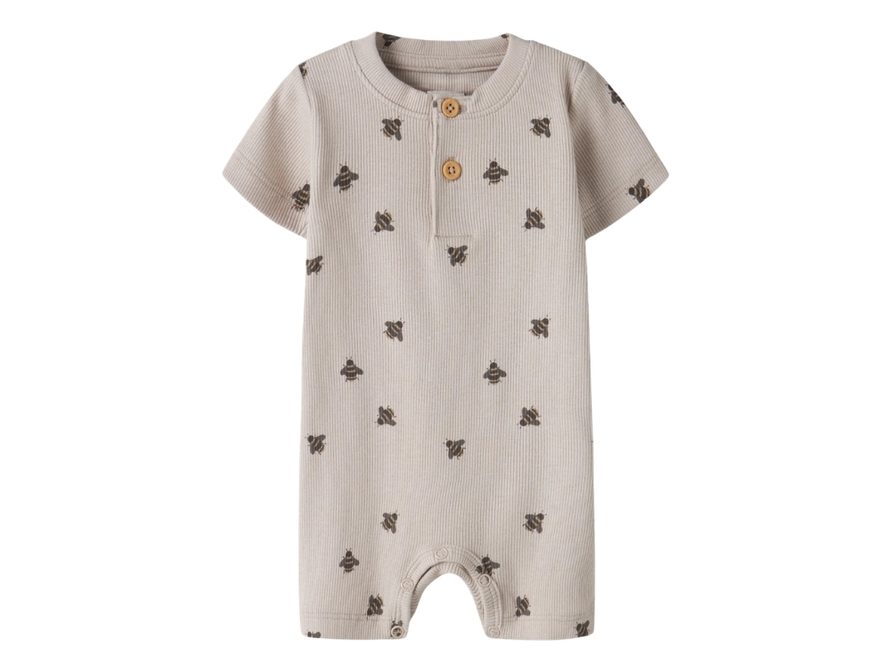 Designet har korte ærmer og korte ben, knaplukning foran og trykknapper i bunden, som gør den nem at tage af og på. De små bi print er fordelt over hele overfladen og giver et enkelt og roligt udtryk.