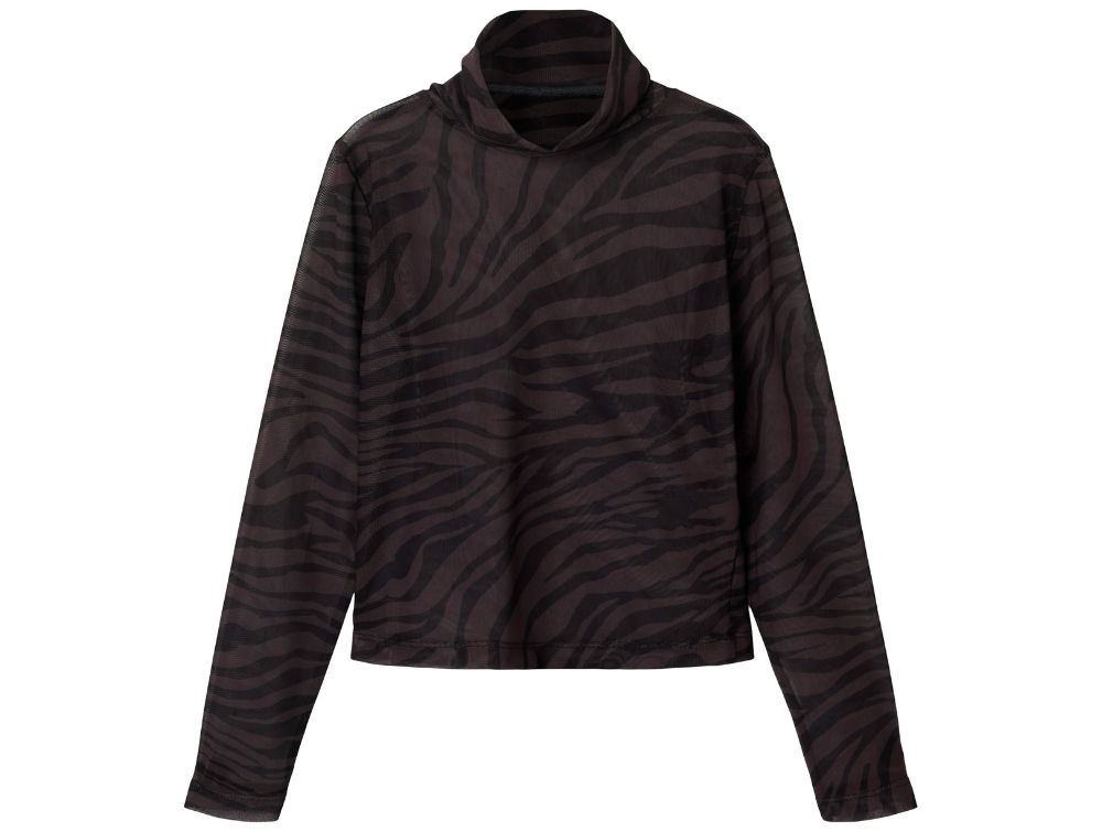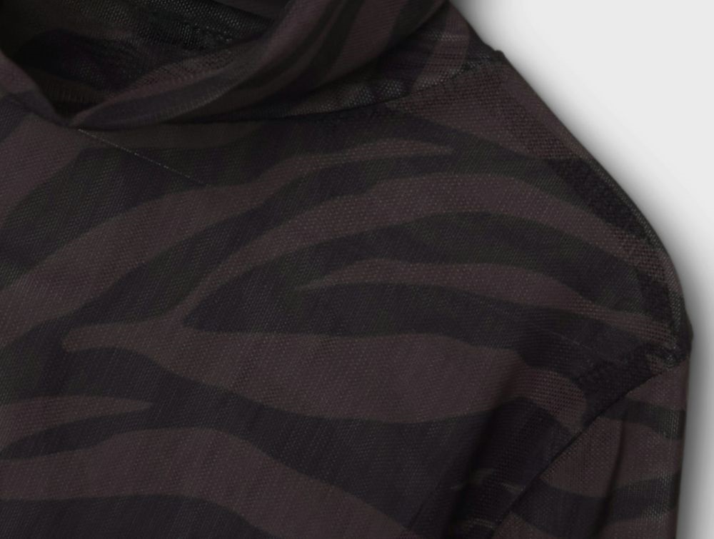 Toppen er lavet i let og strækbar meshkvalitet med tætsiddende pasform. Det zebramønstrede print dækker hele toppen og skaber et stilfuldt udtryk, der både er moderne og iøjnefaldende. Den høje hals tilføjer et ekstra touch af cool.