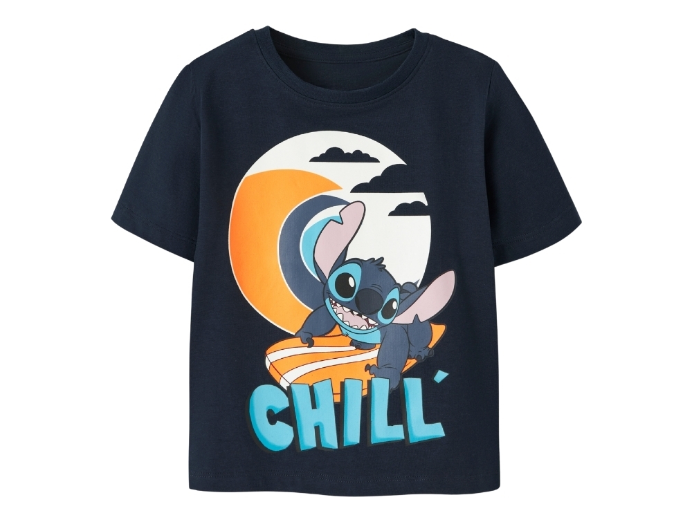 T-shirt i mørkeblå nuance (Navy Blazer) fra Name It med stort print af Disney-figuren Stitch på surfbræt og teksten “Chill”.