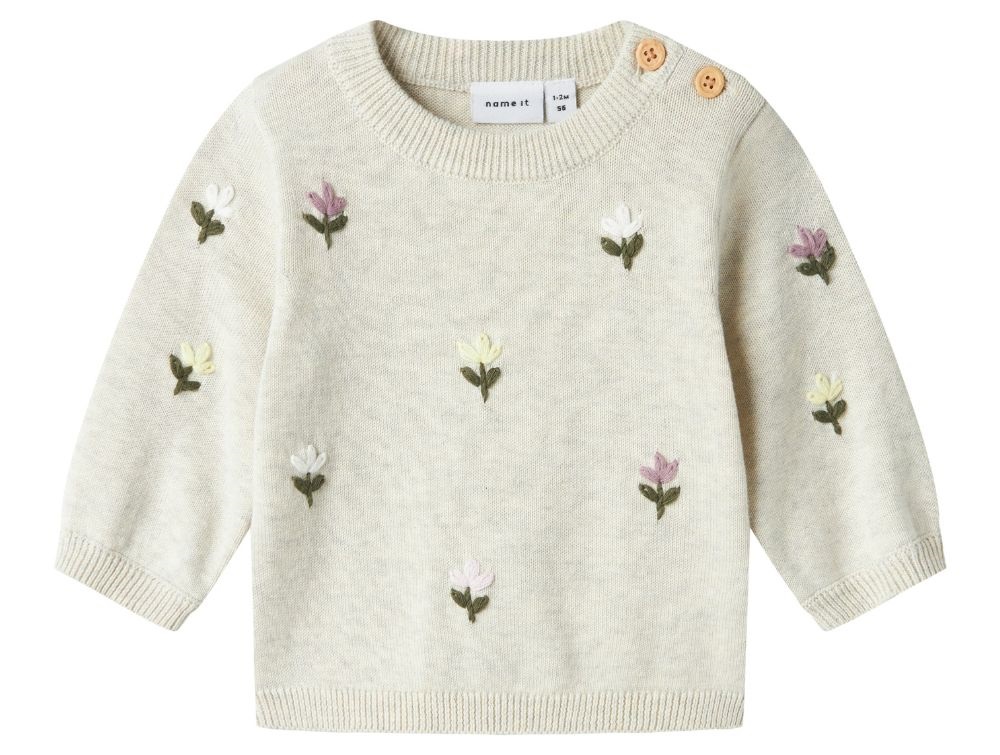Blød og behagelig strikbluse fra Name It i en skøn beige meleret nuance. Blusen er dekoreret med fine broderede blomster i lysegul og lilla, der giver et sødt og stilfuldt udtryk.