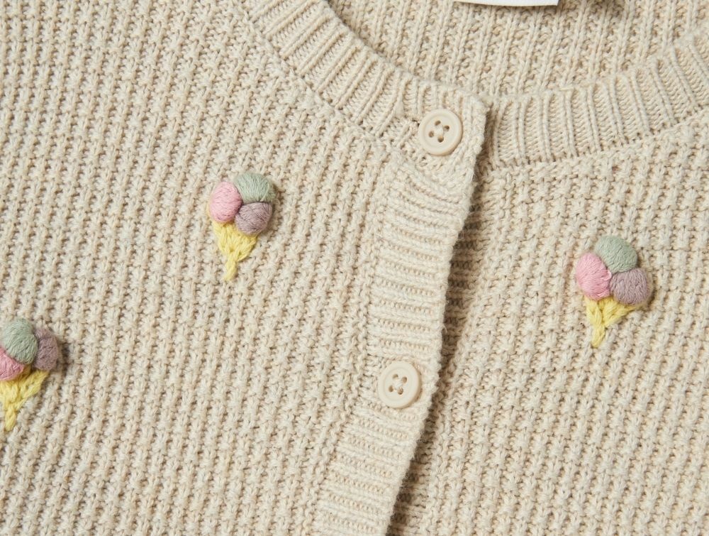 Cardiganen er strikket i 100% økologisk bomuld og har et dekorativt strikmønster. På fronten er den pyntet med små broderede isvafler med kugler i lyserød, lilla og grøn. Den lukkes med matchende knapper og har ribkanter ved hals, ærmer og i bunden.