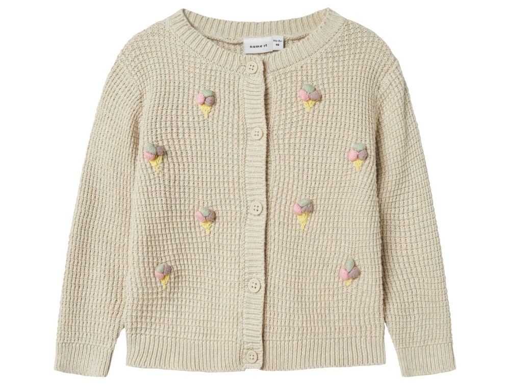 Pige klædt i beige strikcardigan med broderet små isvafler fra Name It 13242354 peyote melangeBeige strikcardigan med broderet små isvafler fra Name It 13242354 peyote melangeBeige strikcardigan fra Name It 13242354 peyote melangeSmå broderet isvafler på beige strikcardigan fra Name It 13242354 peyote melange