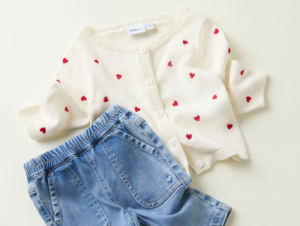 Blød og behagelig strikcardigan fra Name It i en skøn hvid nuance. Cardiganen er dekoreret med fine røde broderede hjerter, der tilfører et sødt og stilfuldt udtryk.