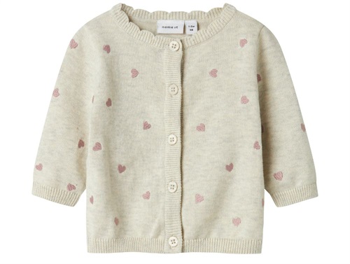 Blød og behagelig strikcardigan fra Name It i en skøn beige meleret nuance. Cardiganen er dekoreret med fine broderede hjerter i lys violet, der tilfører et sødt og stilfuldt udtryk.