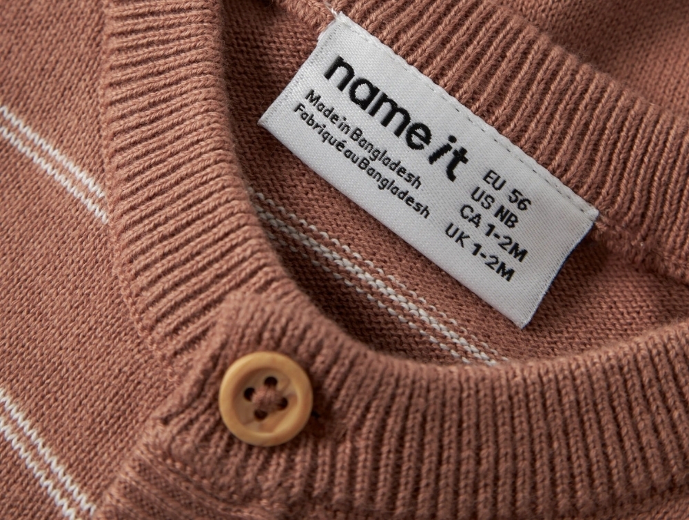 Name It strikcardigan i brun nuance med striberBaby iklædt Name It strikcardigan detalje med label og ribkantName It strikcardigan i brun nuance med knapper foranName It strikcardigan i brun nuance med striber bagfra