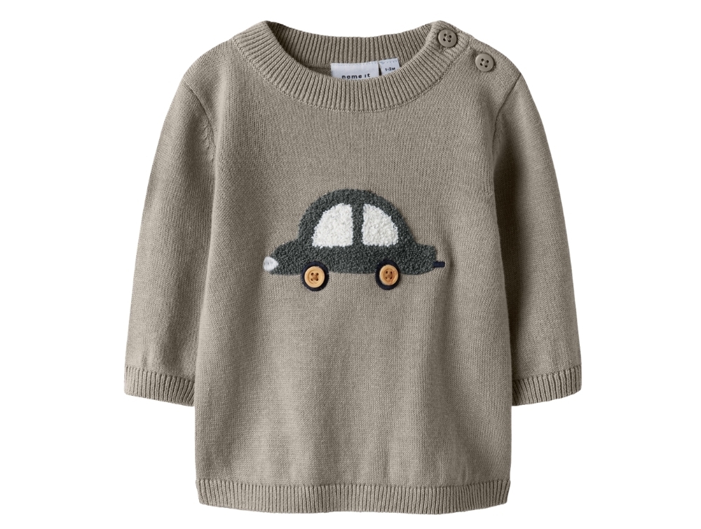 Name It striktrøje i grønlig beige nuance vintage khaki med bilmotiv
