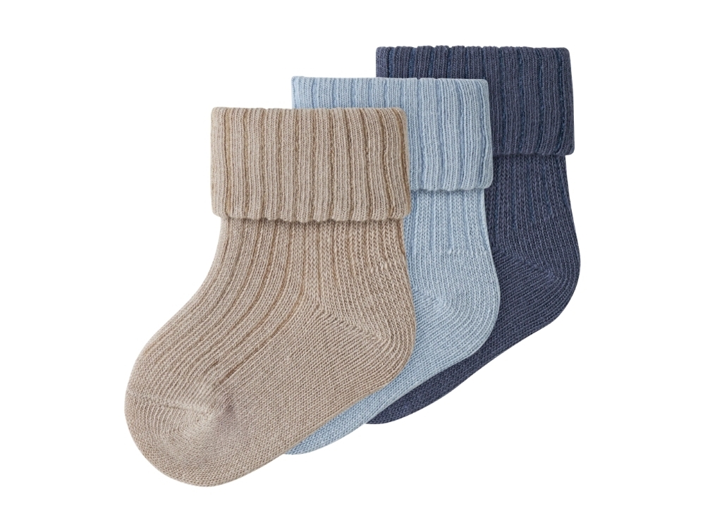 Strømper i beige (Chateau Gray) og blå nuancer (Blue Fog & Vintage Indigo) fra Name It i ribstrikket kvalitet.