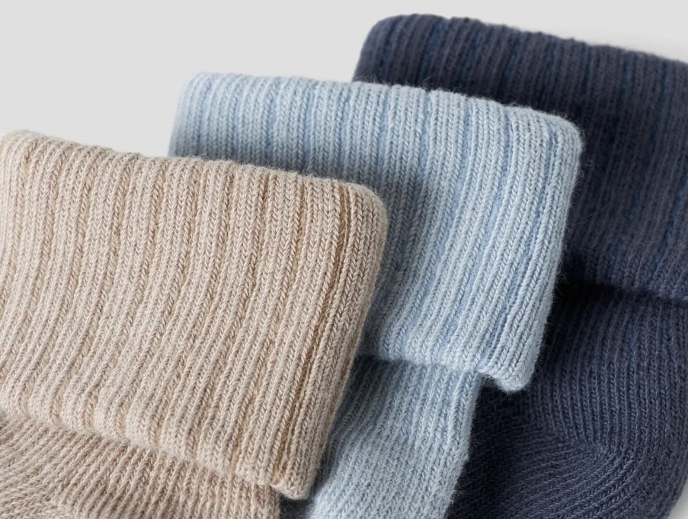 Sættet indeholder tre par strømper i forskellige farver med ribstruktur og foldet kant, som sikrer en god pasform omkring anklen.