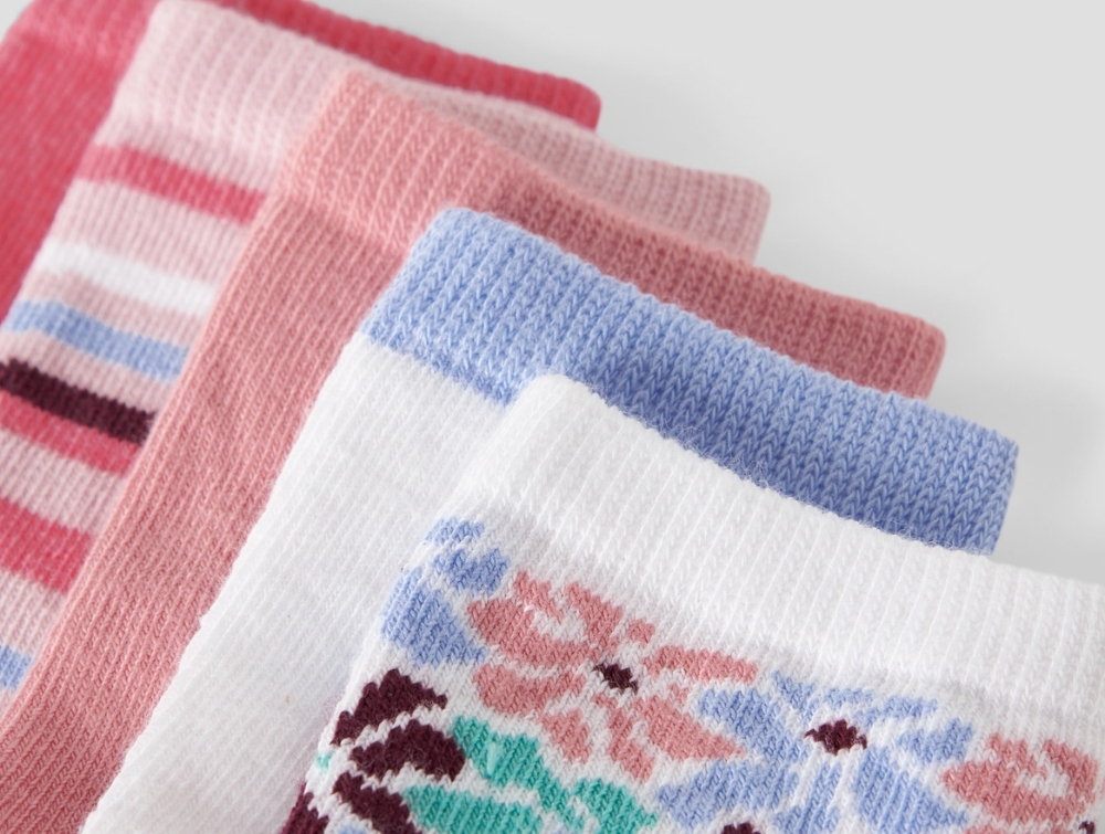 Name It strømper i lyserød og hvid med mønster 5-pakDetalje af farverige Name It strømper i 5-pak med blomster og striber