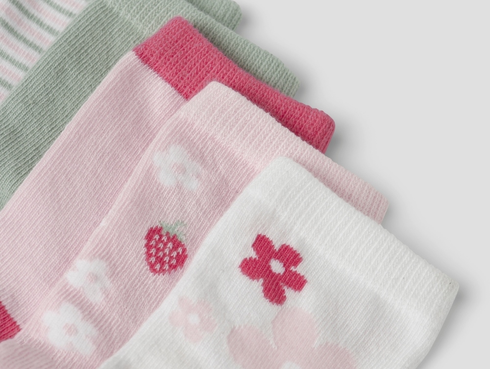 strømper fra Name It i lyse farver med blomster og jordbær5-pak Name It strømper med motiver i pink, grøn og hvid