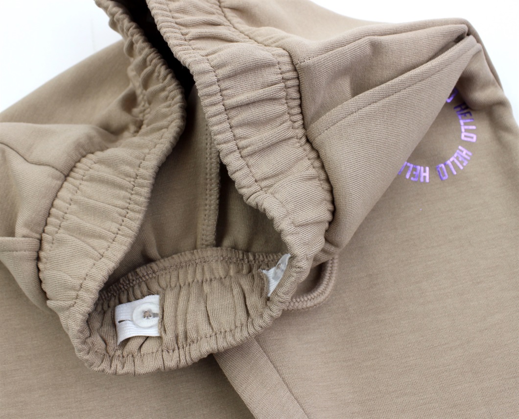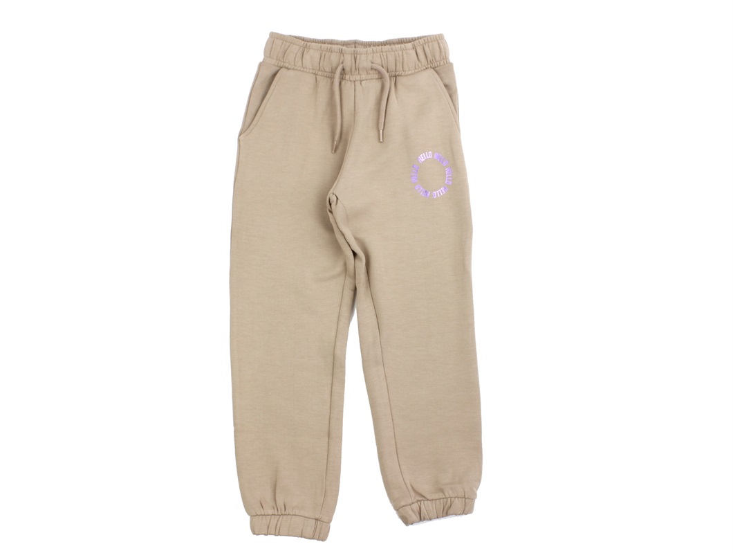 Sweatpants fra Name It i farven stucco med metallic lilla "hello" tekst i ring.