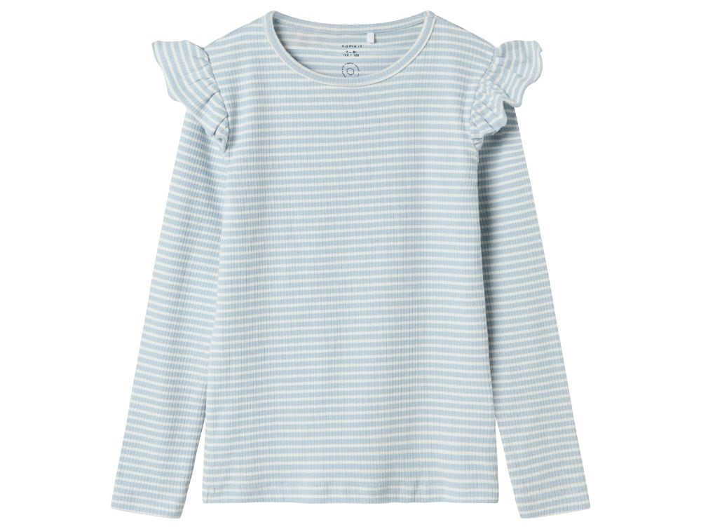 Top fra Name It med lyseblå striber og fine flæsedetaljer.
