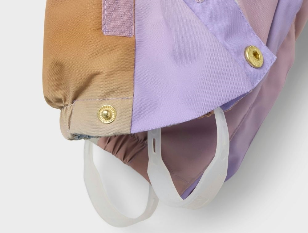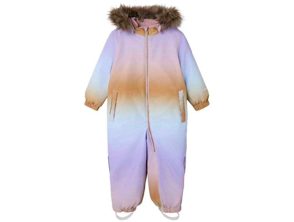 Flyverdragt i farven subdued blue flow fra Name It. Flyverdragten har en aftagelig hætte med faux fur og trykknapper.