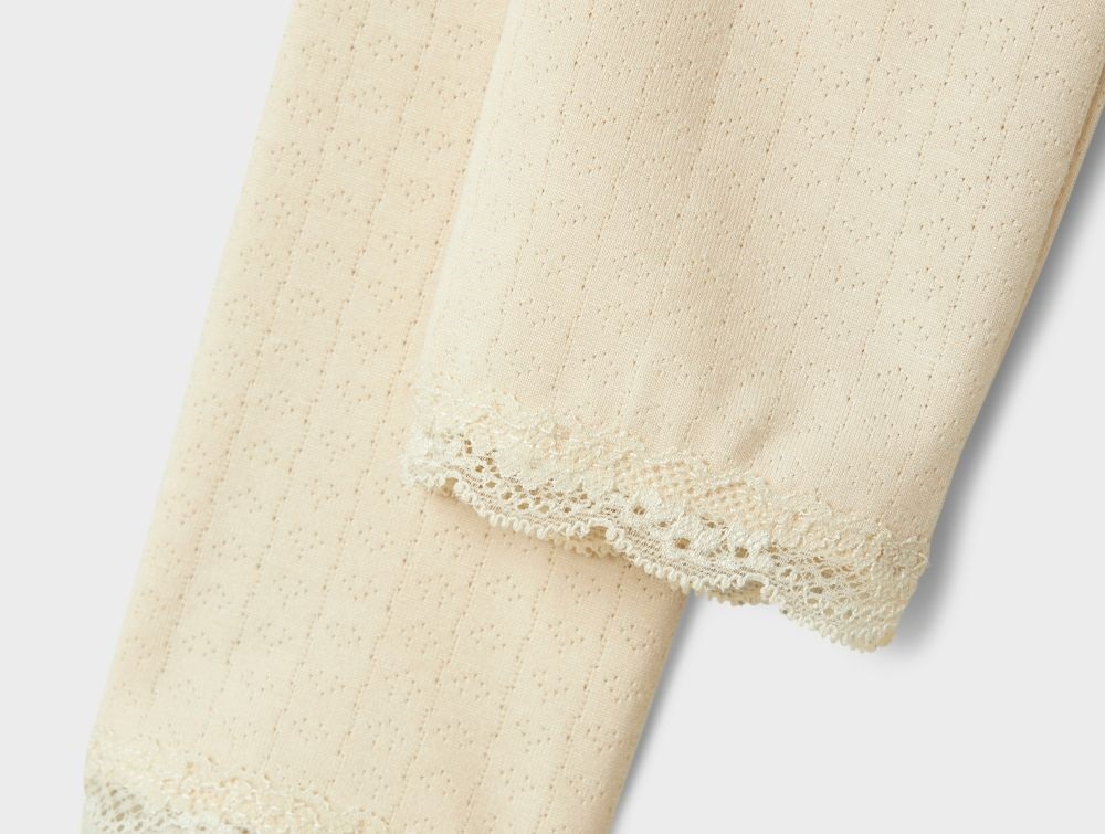Leggings i farven summer sand med blondekant forneden fra Name It. De er lavet af 69% genanvendt polyester, 27% LENZING™ ECOVERO™ viskose og 4% elastan. Maskinvaskes ved 30° finvask.