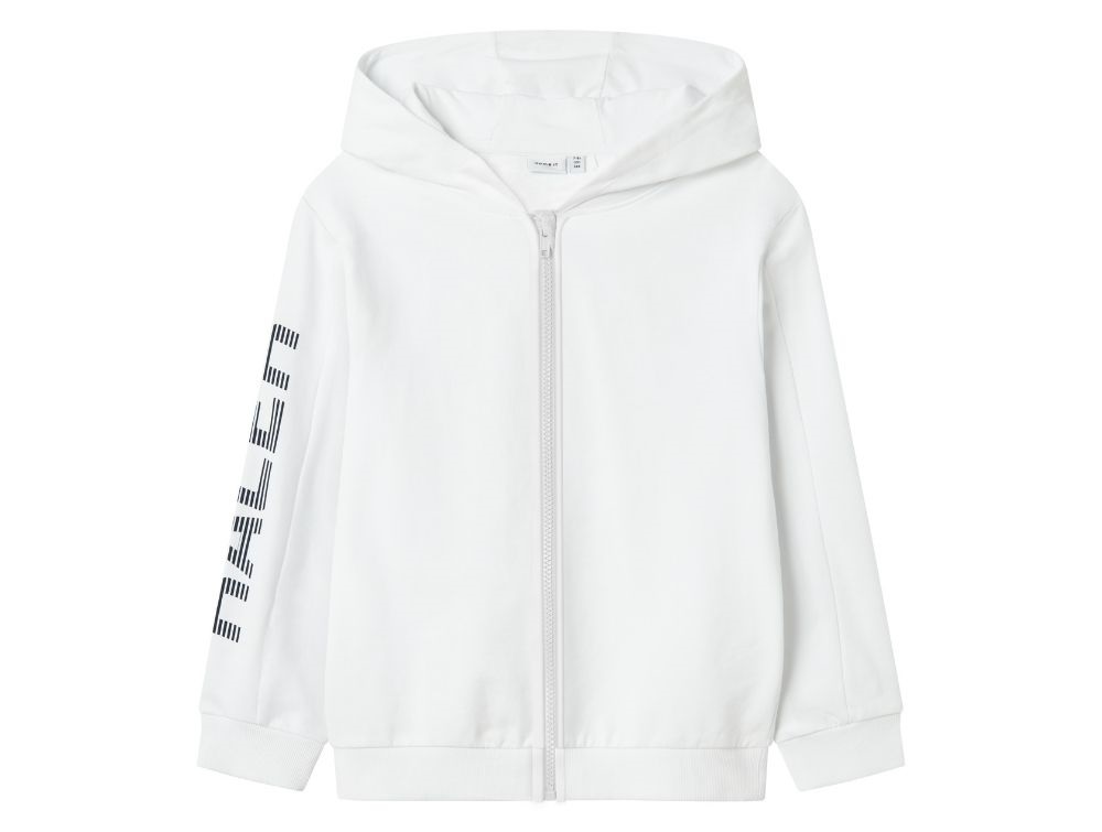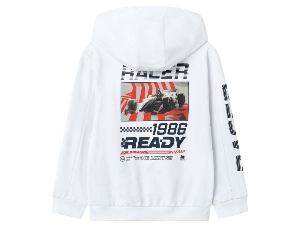Dreng klædt i hvid sweatcardigan med hætte of Formel 1 print på ryg og ærme fra Name It 13242797 bright whiteHvid sweatcardigan med hætte og  Formel 1 print ærme fra Name It 13242797 bright whiteHvid sweatcardigan med hætte og Formel 1 print på ryg og ærme fra Name It 13242797 bright whiteFormel 1 inspireret print på ærmer på hvid sweatcardigan med hætte fra Name It 13242797 bright white