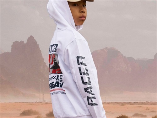 Cardiganen har hætte og lukkes med lynlås. På venstre ærme ses et mørkeblåt "Racer"-print, og på ryggen er der et større print inspireret af Formel 1 racerløb. Modellen har ribkanter ved ærmer og bund.