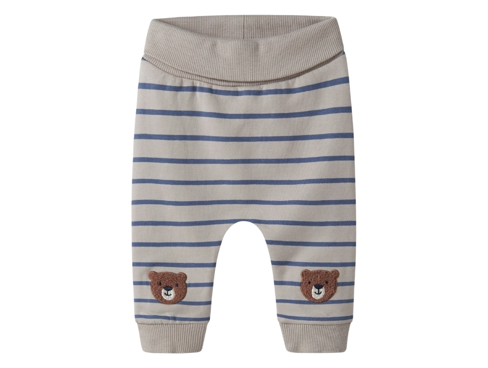Sweatpants i beige nuance (Chateau Gray) fra Name It med blå striber og bjørnebroderi på knæene.