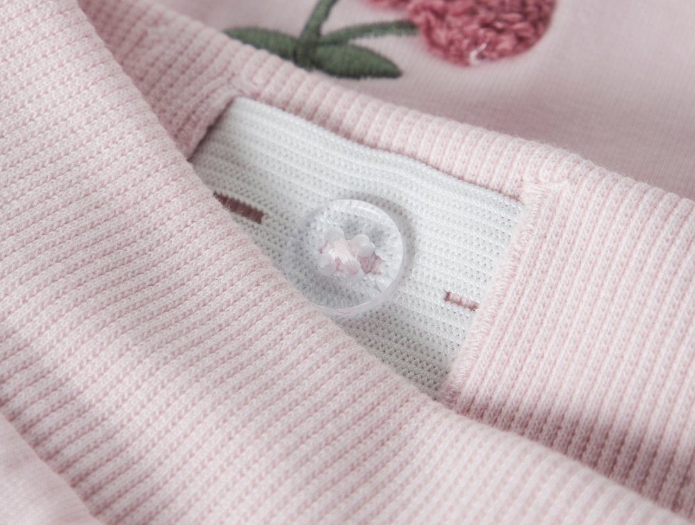 Designet har ribkant ved anklerne, som hjælper med at holde bukserne på plads. De små kirsebærbroderier giver et dekorativt præg.